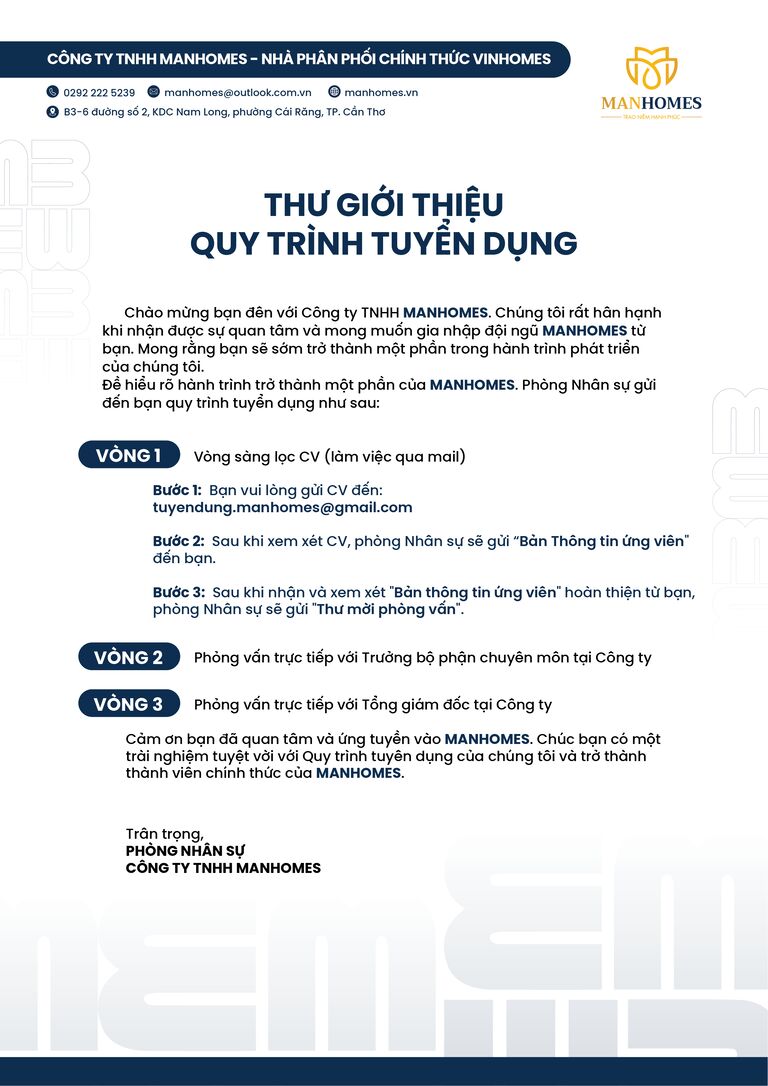 Cám ơn bạn đã ứng tuyển vào Manhomes. Chúc bạn có một trải nghiệm tuyệt vời với quy trình phỏng vấn của chúng tôi và thành công trở thành thành viên chính thức của Manhomes.
